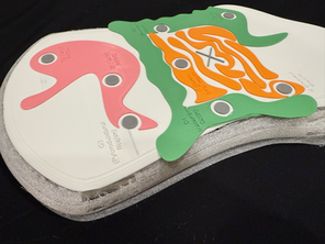 The outer layer acts like a protective lid and visual guide for the whole device. It is made from TPU that is smooth, wipeable, and resistant to sweat and everyday wear. On its surface, a simplified anatomical diagram of the stomach and intestines is printed, with clearly labeled regions and circular marks indicating the underlying electrode positions